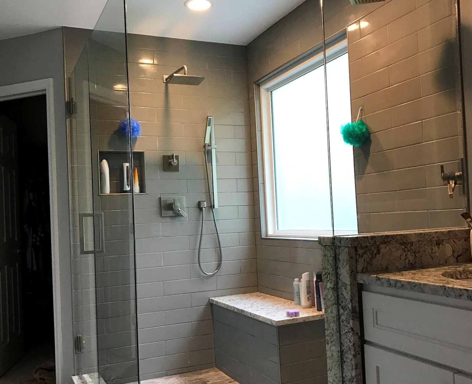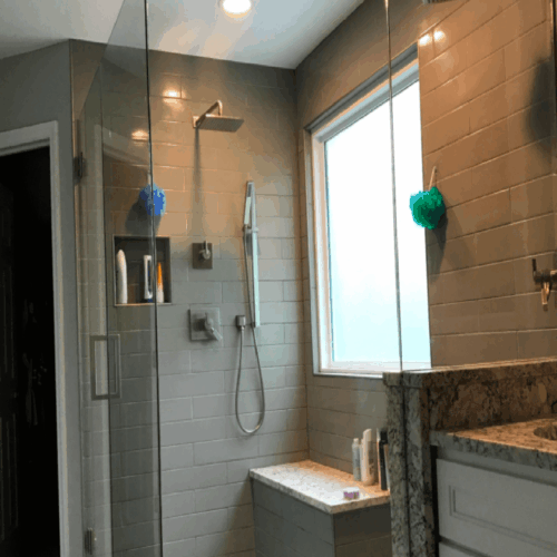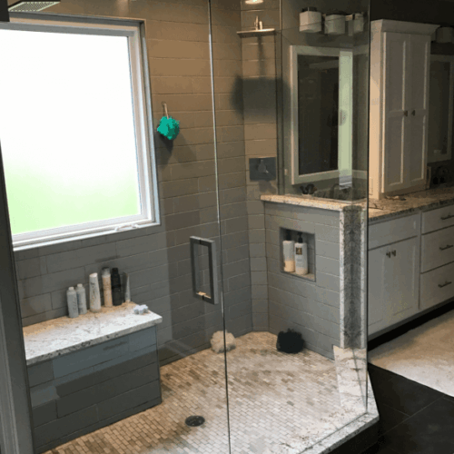 Lewis Center Bathrooms After This project was done for a client in Lewis Center, OH. Customer wanted a grey colored title, and we made it happen. We added better lighting along with matching marbles for the sink area. Let us know if you need yours remodeled. Delaware Westerville Powell Miscellaneous Mt Vernon Grove City